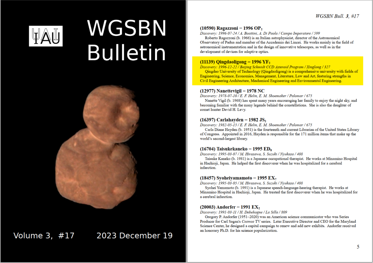 从2023年12月19日国际天文学联合会(IAU)发布的《小天体命名公报》获悉,中国科学院国家天文台1996年12月22日发现的、国际编号为11139的小行星,经国际小行星命名委员会批准,被正式命名为“青岛理工星”,即(11139)Qingdaoligong = 1996 YF2。从此,浩瀚的宇宙星空中新添了一颗以青岛理工大学命名的小行星。青岛理工大学成为山东省属高校中首次拥有专属小行星命名的高校。